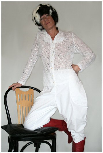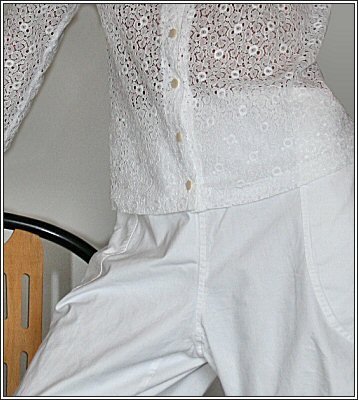 Reine Baumwolle kann so vielfältig wirken. Hose aus festem Stoff und Bluse aus feiner Spitze im Reiter-Still.