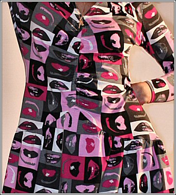 atelier-n damenmode "Pop-Art" Kleid aus T-Shirt Jersey - Baumwolle Stoff mit "Marilyn-Monroe-Kiss"-Motive. DetailRaffungen an dem Oberteil korrespondieren mit dem leicht gerafften Rock. ←zurück vor→ Zur Übersicht