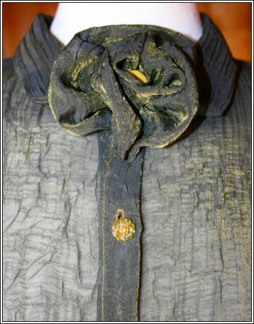 atelier-n damenmode "Chartreuse" Bluse und Hose aus Crash Chiffon mit goldenem Schimmer. DetailAbnehmbare Brosche in Form einer Blume. ←zurück vor→ Zur Übersicht