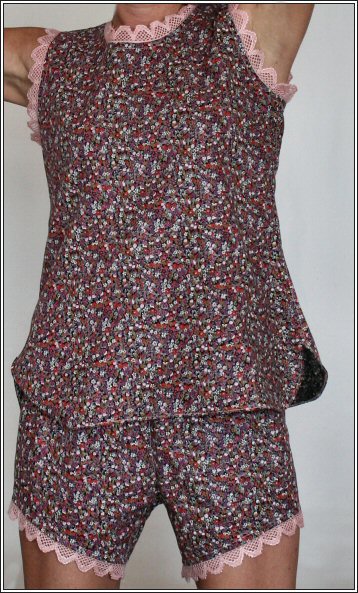 Hochwertige Baumwolle mit kleinen Blumen-Motiven. Spitze am Top und Shorts.